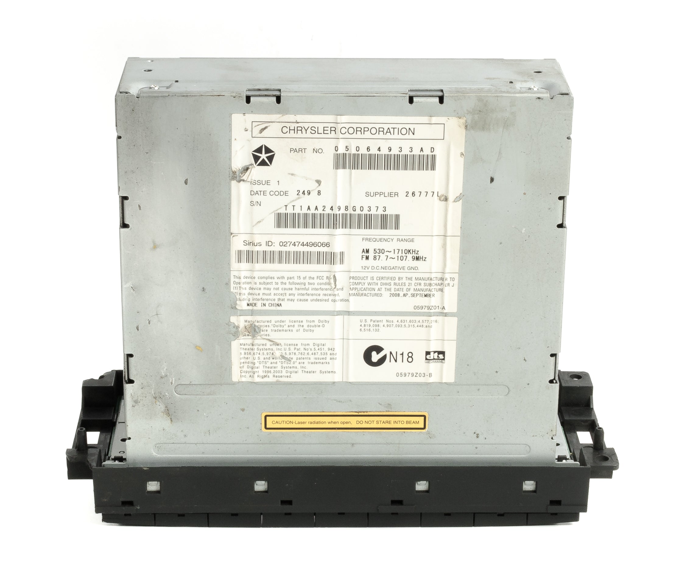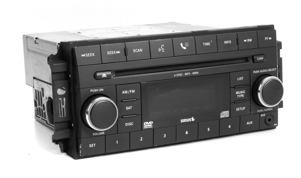 2008 - 2009 - 2010 Jeep & Dodge Car & Truck Radio Fits Various Vehicles - Check your part number AM FM 6 Disc MP3 & WMA CD & DVD Player with Sirius Satellite & Aux Input. Part Number: 05064933AD. Option Code: REQ. The application chart is for preliminary fit only. We are selling this part as a replacement for the same part only! It utilizes a data stream and cannot be used to upgrade or downgrade from another model! If you are unsure of fit, please call a Chrysler dealer with your VIN and this radio's part number. They will let you know if it is compatible. FULLY FEATURED REQ OPTION CODE. YES ALL THE BUTTONS WORK! YES EVERYTHING WORKS! BUY YOUR RADIO FROM A CAR RADIO SERVICE SPECIALIST. Used in many models from 2008 - 2010. This radio has steering wheel control feature and a Sirius satellite tuner. Appearance is GOOD, with some wear on the display, as pictured. Function is perfect and guaranteed with 90 Day Warranty! In certain cases, this radio may need to be unlocked by a dealer. Contact your local dealer for more information. Please have your VIN and this part number ready.