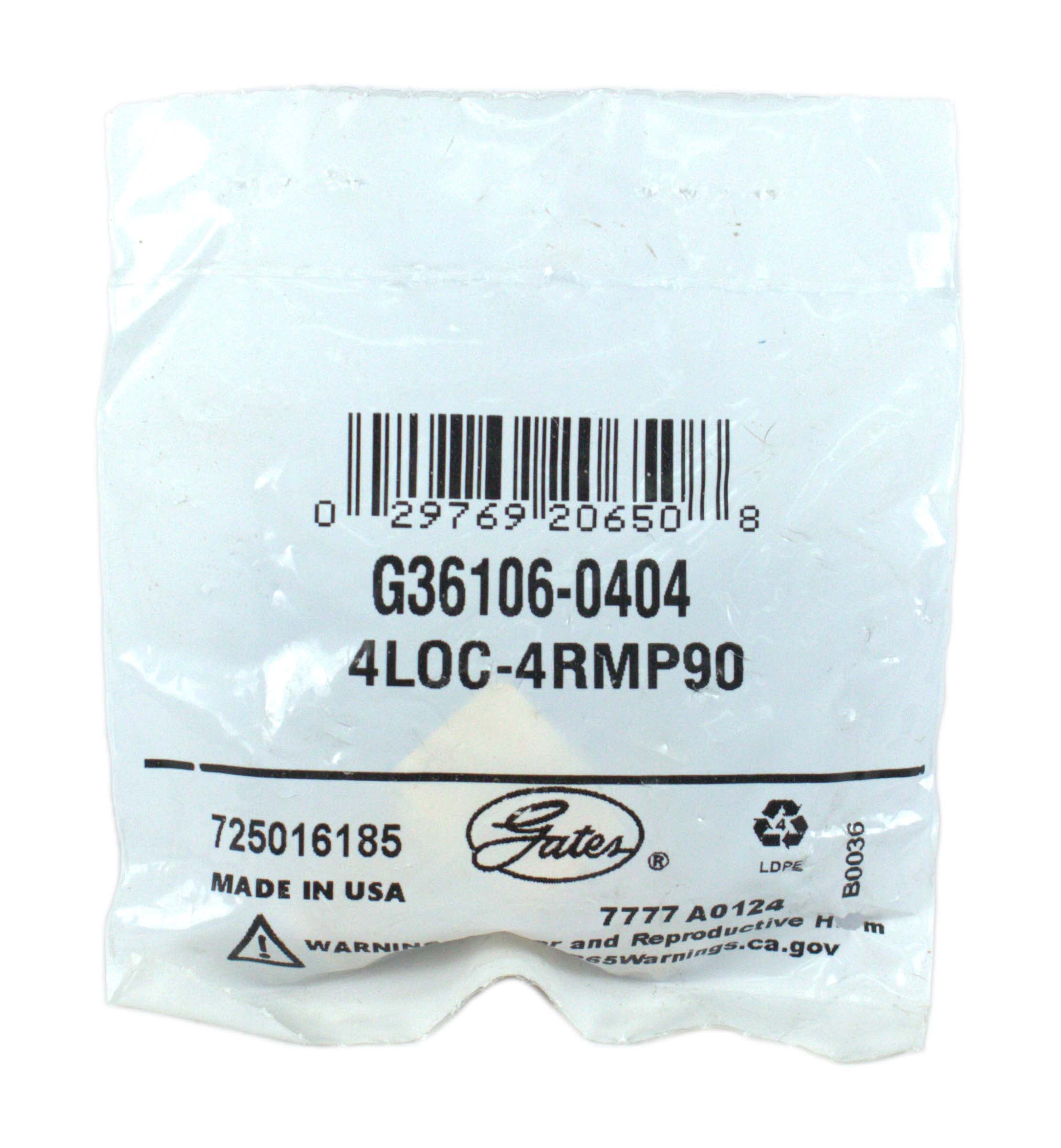 Gates Male Pipe 90 Block with Cone Seat (LOC & LOL Hose) Male Pipe 90 Block with Cone Seat (LOC & LOL Hose) Features: For use with LOC and LOL hose Lock-On barbed stem fittings are quick connecting and resistant to damage from high vibration diesel applications Hose clamps or ferrules are not needed or recommended Temperature Range: -40 Deg. F to +250 Deg. F (-40 Deg. C to +121 Deg. C) Specifications: UPC: 029769206508 Unit of Measure: Each Coupling Description: LOC & LOL Hose Male Pipe 90 Block w/ Cone Seat Industrial Description: 4LOC-4RMP90 Thread Size: 1/4-18 Inside Diameter: .25 IN Hydraulic Hose Recommendation: Gates LOC 1-Fiber Braid Lock-On, LOL Plus Lock-On Cut-Off Length: .38 IN Maximum Working Pressure: 300 PS Temperature Rating: -40 Deg. F to +250 Deg. F (-40 Deg. C to +121 Deg. C) Material: 360 Brass Inside Diameter: 6.4 MM Cut-Off Length: 9.7 MM GATES G36106-0404 Cross References: Anderson Fittings 07220-0404 Goodyear 22625-0404 Mid-America Fittings Inc 29POE-44 NAPA G36106-0404 Fitment: Gates LOC 1-Fiber Braid Lock-On, LOL Plus Lock-On - Brand New Item - Part Number: G36106-0404 90 Day Warranty Included! ----------------------------------------------------- 1 Factory Radio is proud to introduce our line of liquidation listings! These are new items that are priced to move. Any cosmetic blemishes are noted in the condition field so please keep that in mind when purchasing. All items are guaranteed to be in 100% working order with our standard 30 day return and 90 day warranty so you’ll still be covered by our top-notch customer service. We’ll be adding new listings to this line every day at limited quantities so be sure to bookmark and keep watch for more great deals! ----------------------------------------------------- This is a Gates Male Pipe 90 Block with Cone Seat (LOC & LOL Hose). This item is in NEW condition, with all items included unless otherwise listed. Please see photos for details. As you can see from our reviews, we package and ship everything very carefully. If you have any questions about any item listed, please do not hesitate to reach out. Thank You for Your Purchase!