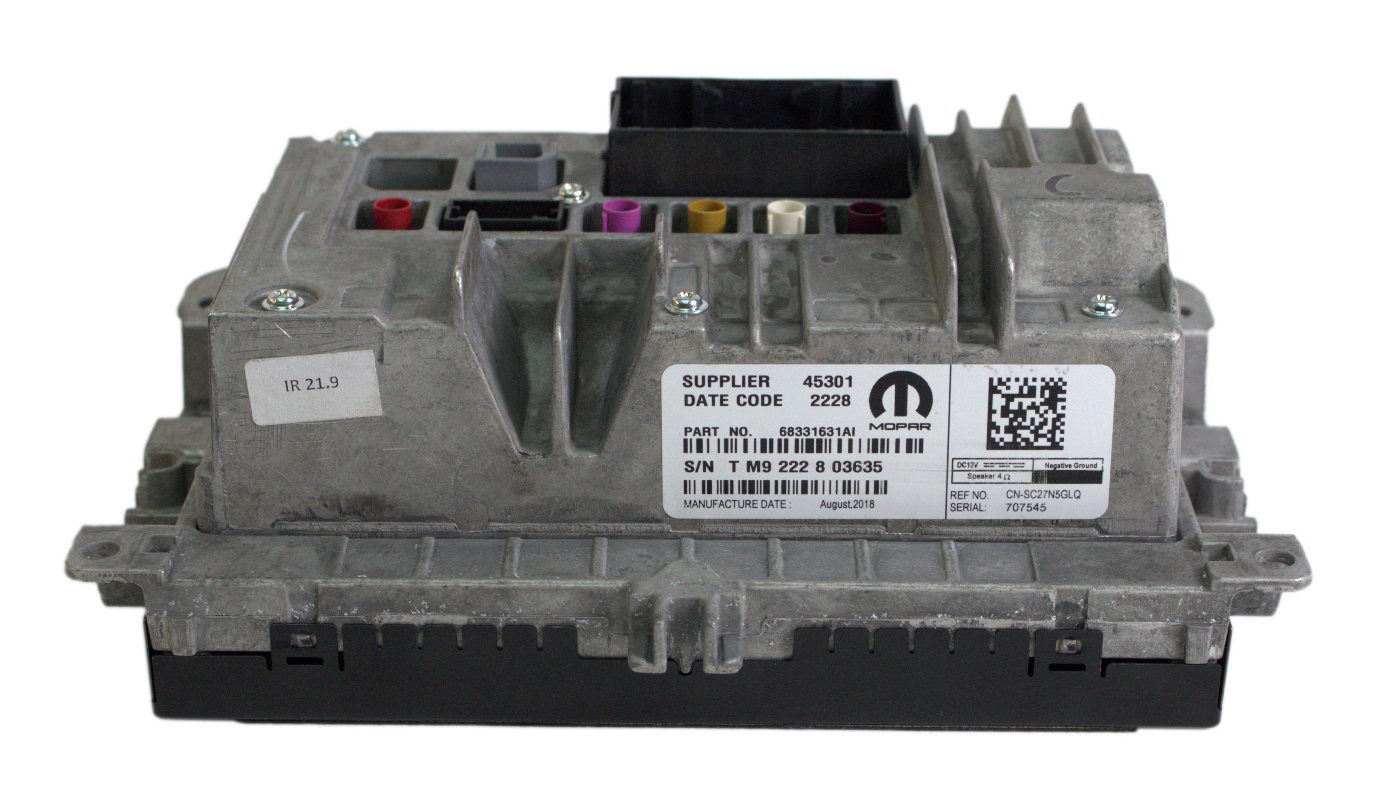 This unit is being sold as a REPLACEMENT ONLY! The part number is 68331631AI. If you do not have this exact part number, or compatible part number currently in your vehicle, it will likely NOT WORK. If you are unsure of your part number, contact us with your VIN and they should be able to provide you with the correct part number. They may look the same and have the same plugs but data streams may be different, not allowing them to code. For example, external amps are used in some cars and will not allow interchange, etc.