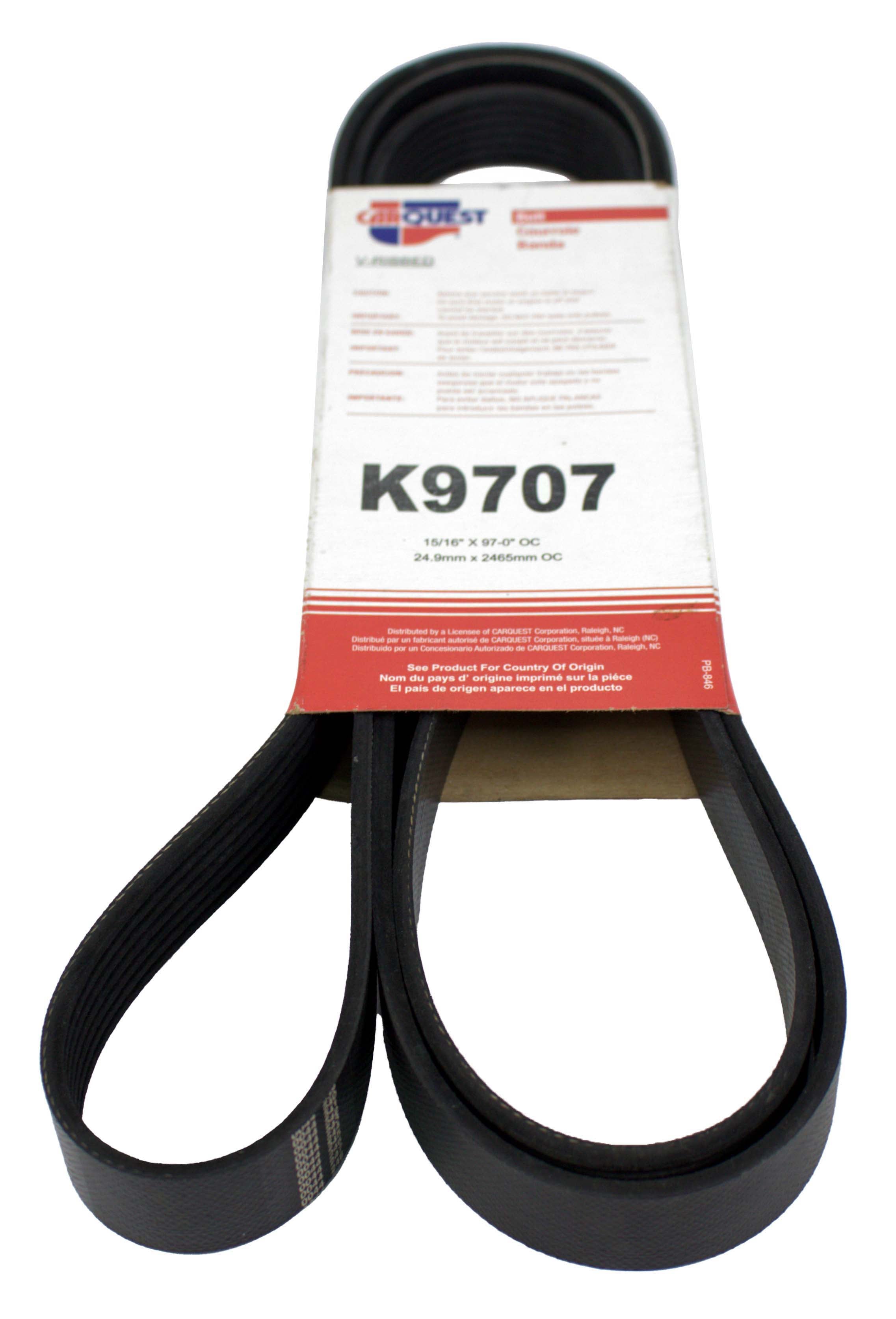 Carquest V-Ribbed Serpentine Belt 15/16in x 97in This high-quality CarQuest V-ribbed Belt K9707 is perfect for your car or truck's accessory belt needs. It is designed to fit seamlessly with your engine and provide reliable performance. Made from durable materials, this belt is built to last and withstand regular use. With a focus on quality and durability, this CarQuest V-ribbed Belt K9707 is an ideal choice for anyone in need of a reliable accessory belt. Featuring a smooth, efficient design, this belt is perfect for keeping your car or truck running smoothly. Whether you're a professional mechanic or a DIY enthusiast, this belt is sure to meet your needs and exceed your expectations. Fitment: 1999-03 Dodge Ram Trucks - Brand New Item - Part Number: K9707 90 Day Warranty Included! ----------------------------------------------------- 1 Factory Radio is proud to introduce our line of liquidation listings! These are new items that are priced to move. Any cosmetic blemishes are noted in the condition field so please keep that in mind when purchasing. All items are guaranteed to be in 100% working order with our standard 30 day return and 90 day warranty so you’ll still be covered by our top-notch customer service. We’ll be adding new listings to this line every day at limited quantities so be sure to bookmark and keep watch for more great deals! ----------------------------------------------------- This is a Carquest V-Ribbed Serpentine Belt 15/16in x 97in that is fits the vehicles listed above. This item is in NEW condition, with all items included unless otherwise listed. Please see photos for details. As you can see from our reviews, we package and ship everything very carefully. If you have any questions about any item listed, please do not hesitate to reach out. Thank You for Your Purchase!