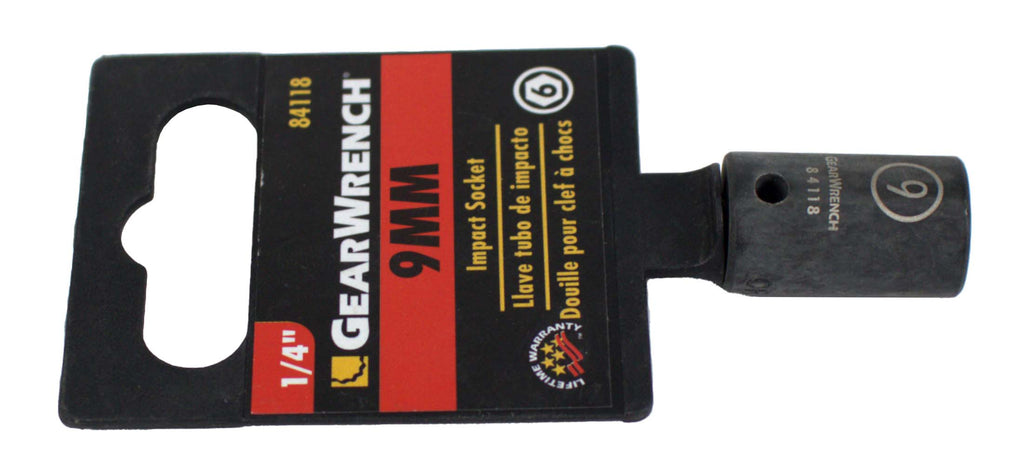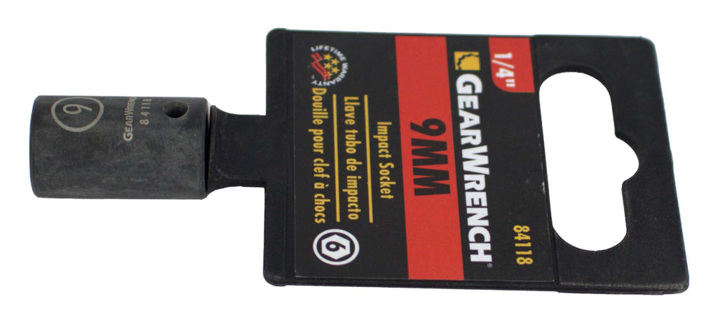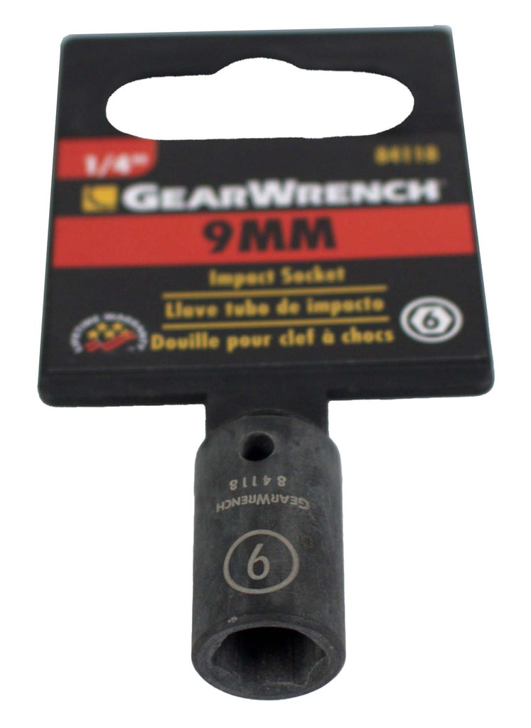 GearWrench 9mm Metric Impact Socket 1/4" Drive 6 Point Features & Benefits 6 Point Metric 9mm Fits 1/4" Drive Off-corner loading design reduces fastener rounding Manganese phosphate finish to resist corrosion High-visibility laser-etched markings provide quick size identification Secondary hard stamped size markings - Brand New Item - Part Number: 84118 90 Day Warranty Included! ----------------------------------------------------- 1 Factory Radio is proud to introduce our line of liquidation listings! These are new items that are priced to move. Any cosmetic blemishes are noted in the condition field so please keep that in mind when purchasing. All items are guaranteed to be in 100% working order with our standard 30 day return and 90 day warranty so you’ll still be covered by our top-notch customer service. We’ll be adding new listings to this line every day at limited quantities so be sure to bookmark and keep watch for more great deals! ----------------------------------------------------- This is a GearWrench 9mm Impact Socket. This item is in NEW condition, with all items included unless otherwise listed. Please see photos for details. As you can see from our reviews, we package and ship everything very carefully. If you have any questions about any item listed, please do not hesitate to reach out. Thank You for Your Purchase!