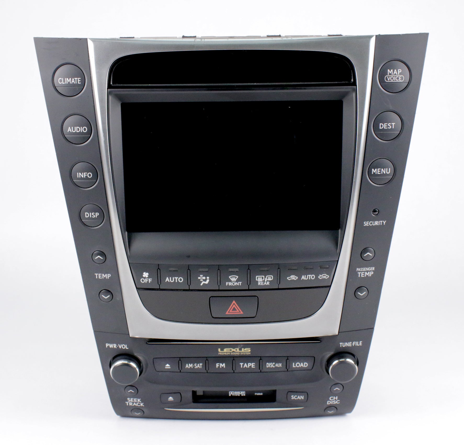 This is a professionally remanufactured AM FM Satellite-Capable Radio, 6 Disc CD/Cassette Player, with attached Climate Control Panel and Navigation Screen that fits a 2008-2009 Lexus GS450H. Please see pictures for more cosmetic details. This item has been cleaned, serviced as needed and thoroughly checked. Function is in 100% working order!
