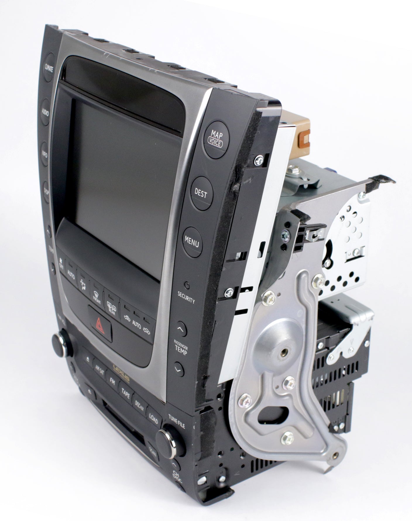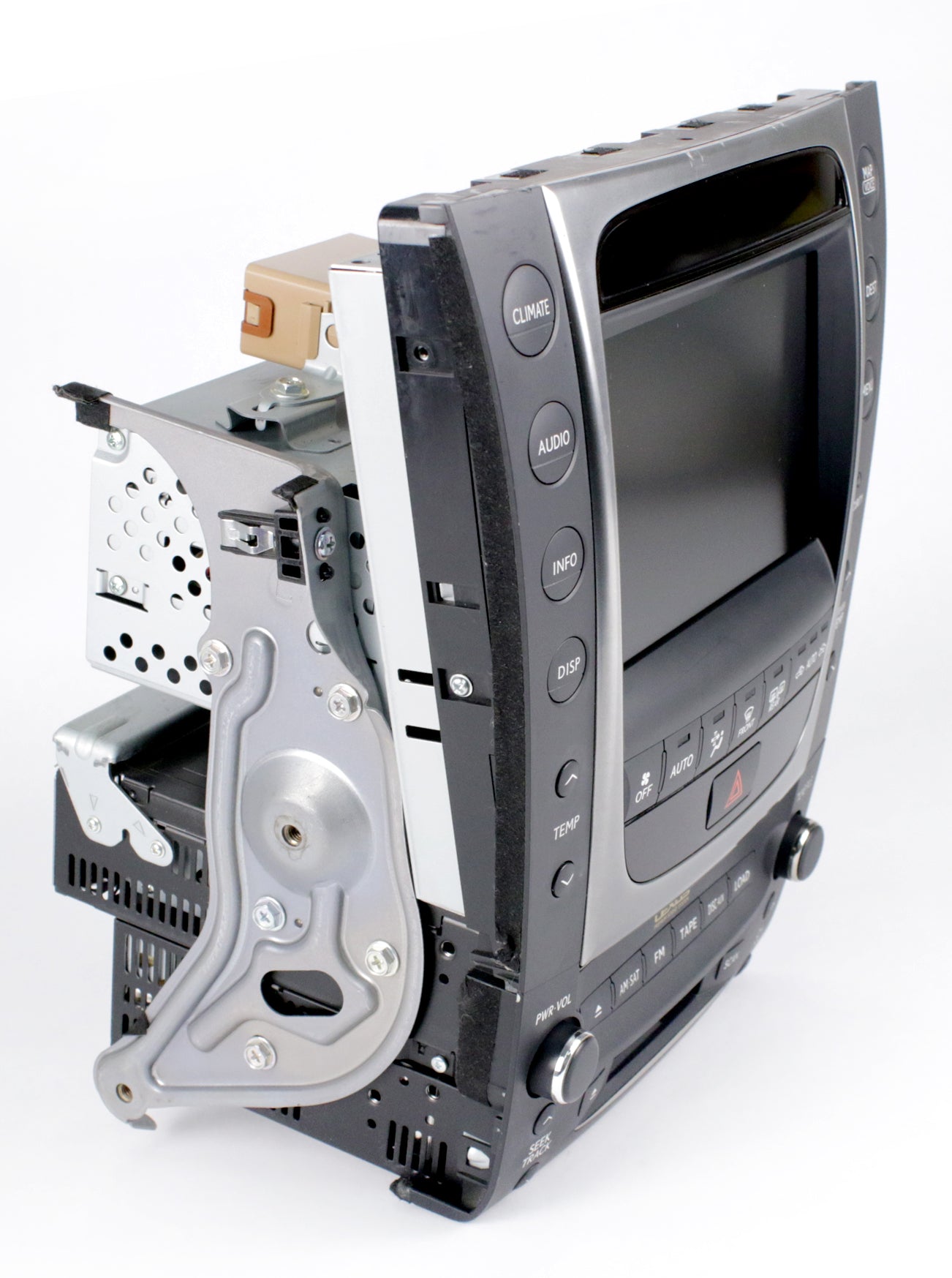 AM FM Satellite-Capable Radio, 6 Disc CD/Cassette Player, with attached Climate Control Panel and Navigation Screen
