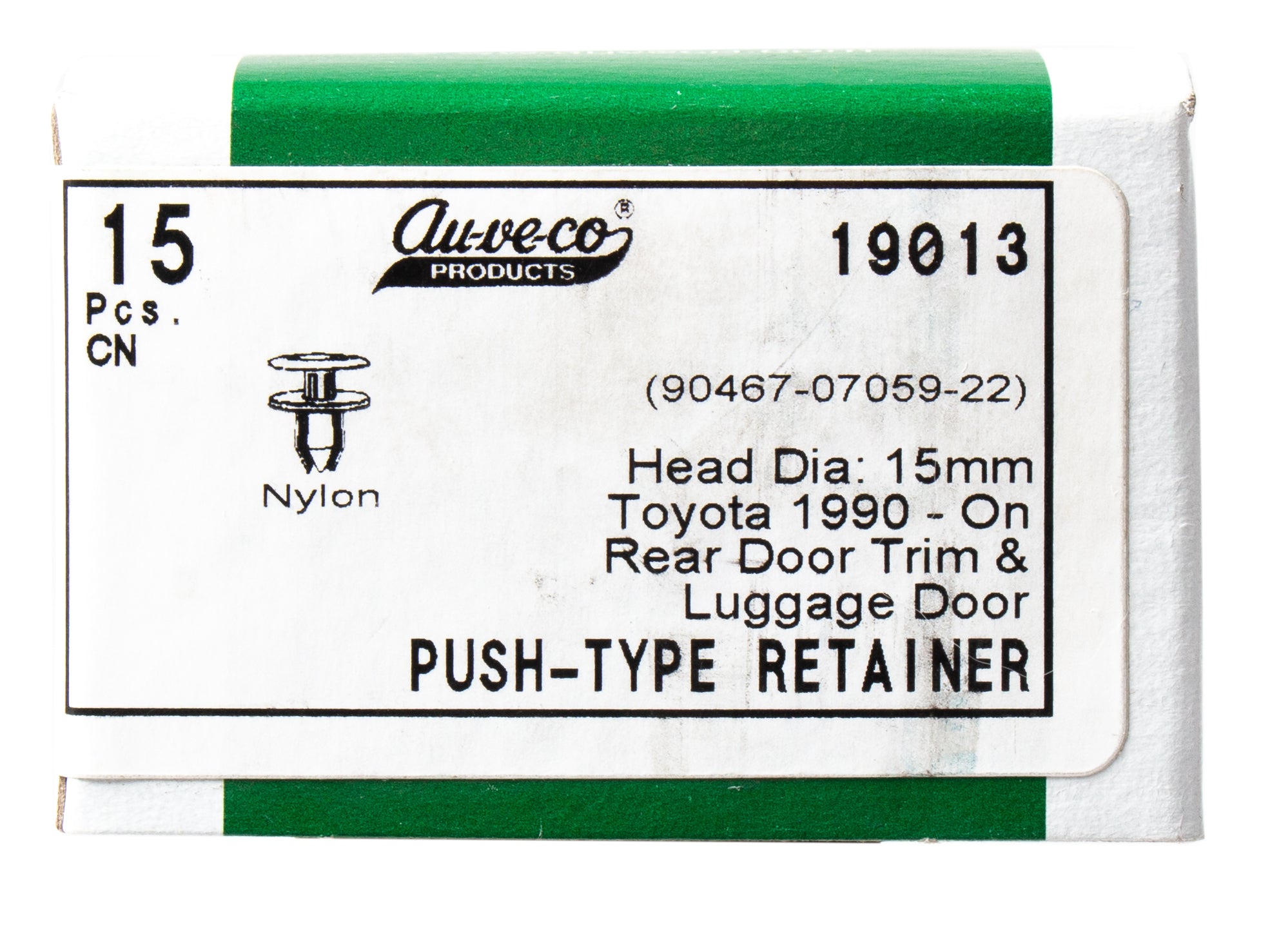 This is a box of 15 Au-ve-co Products Au-ve-co Products 19013 Rear Door Trim & Luggage Compartment Door Push-Type Retainer, that fits a large amount of Toyota vehicles as listed above! This item is in NEW condition, with all items included unless otherwise listed. Please see photos for details.