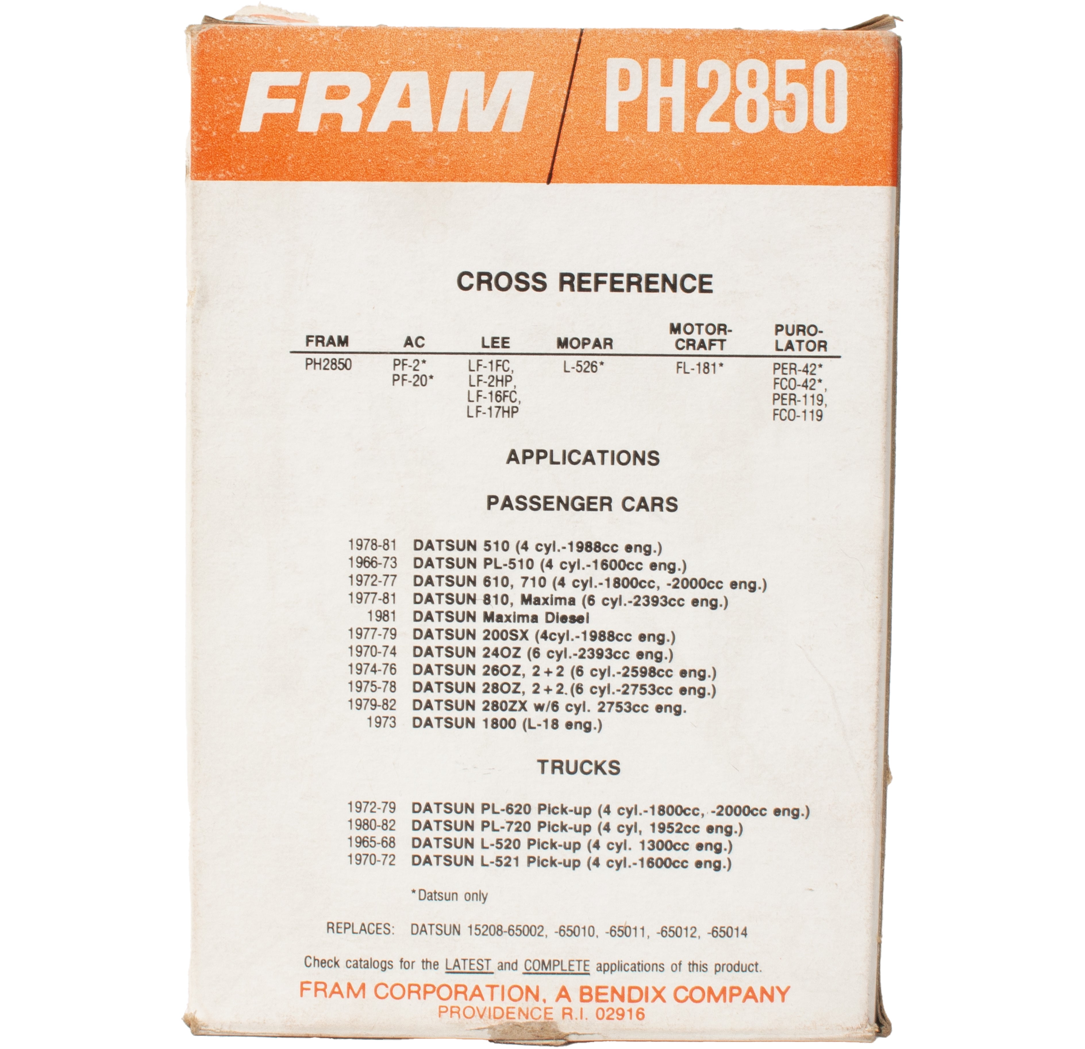Nissan - 240Z L6 2.4 (1971); 510 L4 1.6 (1971); 521 Pickup L4 1.6 (1970-1972); 620 Pickup L4 1.6 (1972-1973), L4 1.8 (1974); 710 L4 1.8 (1974); 720 L4 2.5 (1983-1986); 810 L6 2.8 (1981)